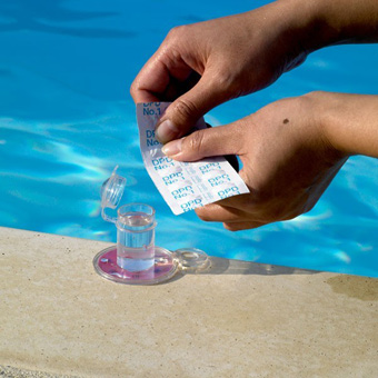 このキットで水を測定し、pH値と塩素濃度が理想的であるかを確認します。測定後、必要に応じてpH処理剤、塩素剤を投入して健全な水質を維持してください。